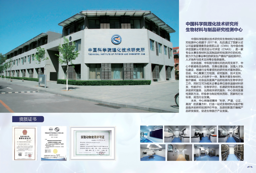 中国科学院理化技术研究所生物材料与制品研究检测中心(以下简称“中心”)成立于2017年,实验室总面积达1500平方米,实验设施完备先进。作为专业从事生物材料及其制品研究、检测与评价的机构,中心已先后通过国家认证认可监督管理委员会资质认定(CMA)及中国合格评定国家认可委员会认可评定(CNAS)(详见附件)。中心致力于为企事业单位的研发与生产提供产品检测评价、人才培养、技术支持等全链条服务。