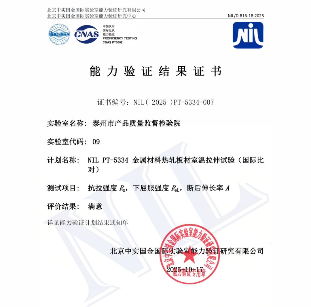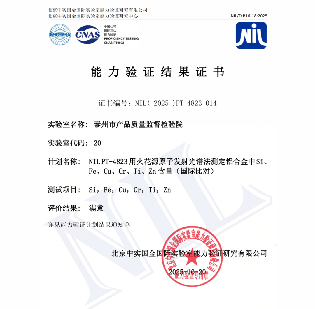 能力验证是评价实验室检验检测能力的有效手段,也是实验室质量管理体系持续改进和不断提高的重要措施。连续两项能力验证的满意结果,是对我院检验检测能力的充分肯定,也是我院检验人员不断锤炼技术能力、追求卓越的体现。今后,我院将继续加强检验检测能力建设,不断拓展检测项目覆盖面,提升检测服务效能,为助力政府工业品安全监管和推动产业高质量发展提供更加坚实的技术支撑。